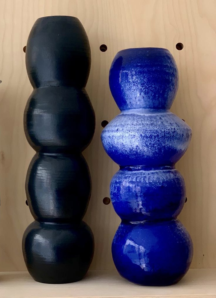 Des vases élancés qui jouent la carte de la hauteur. Entièrement façonnés au tour puis assemblés et émaillés pour leur donner cet aspect brillant ou mat.